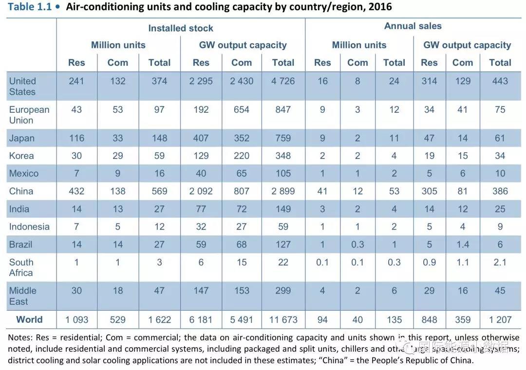 到2016年底全球正在運行的空調(diào)機(jī)有16.22億臺(11673吉瓦),其中家用空調(diào)10.93億臺(6181吉瓦),商戶空調(diào)5.29億臺(5491吉瓦)。在全球范圍內(nèi)中國擁有空調(diào)機(jī)數(shù)量最多,到2016年底共有5.69億臺(2899吉瓦),占全球總數(shù)的35%;其中家用空調(diào)4.32億臺(2092吉瓦),商戶空調(diào)1.38億臺(807吉瓦)。美國空調(diào)數(shù)量全球排在第二位,共有3.74億臺(4726吉瓦),占全球總數(shù)的23%;其中家用空調(diào)2.41億臺(2295吉瓦),商戶空調(diào)1.32億臺(2430吉瓦)。值得注意的是,美國空調(diào)機(jī)數(shù)量雖然比中國少,但是制冷容量卻超出中國一倍,說明美國家庭和商戶的面積比較大,所使用的空調(diào)機(jī)制冷能力也比較大。