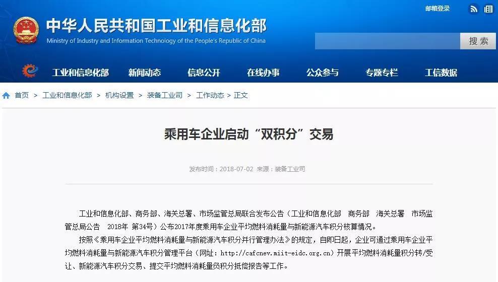 中國儲能網(wǎng)訊:7月2日,工信部裝備工業(yè)司發(fā)布通知,乘用車企業(yè)平均燃料消耗量與新能源汽車積分管理平臺已經(jīng)上線,自即日起,乘用車企業(yè)可在這個平臺上進(jìn)行燃料消耗量積分轉(zhuǎn)/受讓、新能源汽車積分交易。