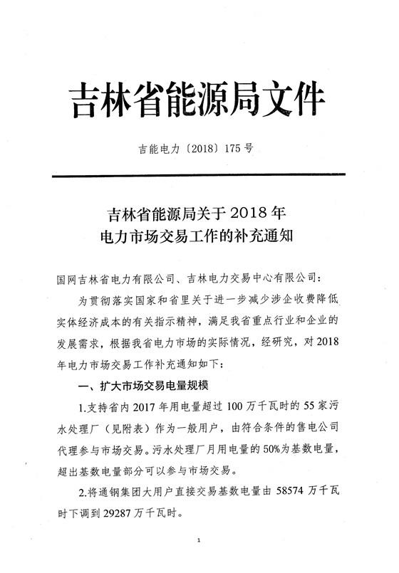 中國儲(chǔ)能網(wǎng)訊:吉林省能源局日前發(fā)布了《吉林省能源局關(guān)于2018年電力市場(chǎng)交易工作的補(bǔ)充通知(吉能電力〔2018〕175號(hào))》,擴(kuò)大市場(chǎng)交易電量規(guī)模,支持省內(nèi)2017年用電量超過100萬千瓦時(shí)的55家污水處理廠(見附表)作為一般用戶,由符合條件的售電公司代理參與市場(chǎng)交易。污水處理廠月用電量的50%為基數(shù)電量,超出基數(shù)電量部分可以參與市場(chǎng)交易。