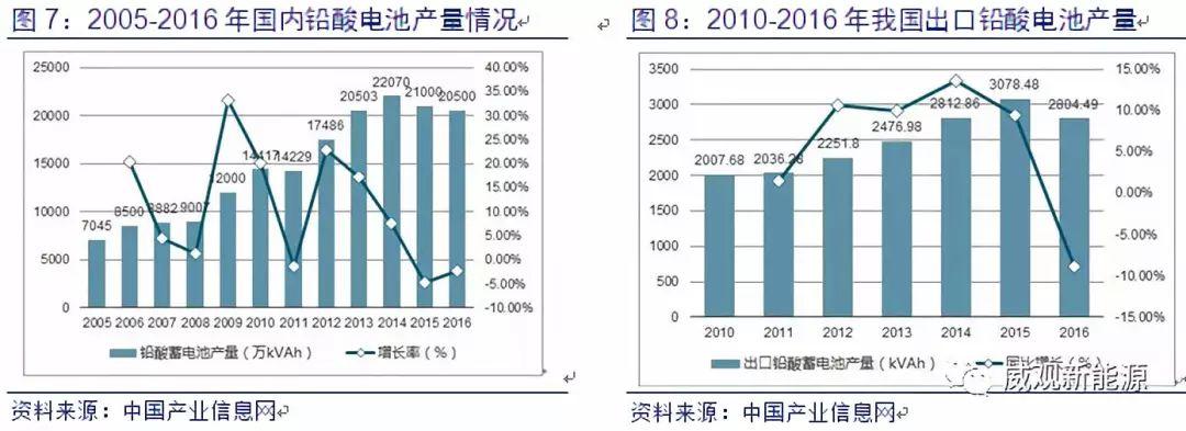 我國是全球最大的鉛酸蓄電池生產(chǎn)國、消費(fèi)國和出口大國。我國鉛酸蓄電池行業(yè)主要實(shí)行以銷定產(chǎn),鉛酸蓄電池生產(chǎn)數(shù)量減去出口的數(shù)量大致為國內(nèi)消費(fèi)數(shù)量。從2005年至2016年,國內(nèi)企業(yè)鉛酸蓄電池產(chǎn)量呈波動式增長,年均復(fù)合增長率達(dá)10.17%。2014年為最高點(diǎn),之后受到鋰離子電池的沖擊,產(chǎn)量開始緩慢減少。