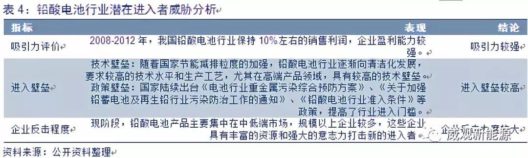 替代品的威脅:目前市場上主要充電電池有鎳氫電池、鉛蓄電池和鋰離子電池,其中鋰離子電池對鉛酸電池具有很強(qiáng)的競爭性。在鋰電池和鉛酸蓄電池的屬性對比中,兩種不同類型的電池各具優(yōu)勢。鉛酸蓄電池最大的優(yōu)勢就是適用溫度帶很寬。在低溫環(huán)境中放電功能良好,在高溫環(huán)境中本體不會發(fā)生爆炸,安全性能高。它的另一個較大的優(yōu)勢則是售價低廉,這得益于它豐富的原料以及高資源循環(huán)率。反觀鋰電池,它的優(yōu)勢在于電池能量密度高,這可以讓它需要高續(xù)航能力的新能源汽車領(lǐng)域打開市場。此外,國家出臺的相關(guān)政策也支持鋰離子電池的發(fā)展。