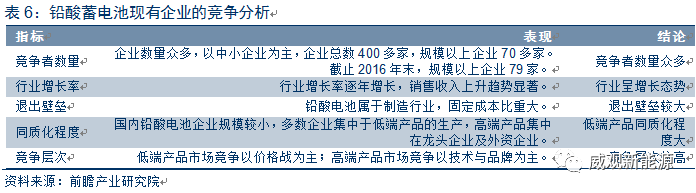 國內(nèi)鉛酸電池企業(yè)價格大戰(zhàn),競爭非常激烈??v觀整個鉛酸蓄電池市場,從競爭數(shù)量、行業(yè)增長率、退出壁壘、同質(zhì)化程度,以及競爭層次來看,鉛酸電池行業(yè)處于成熟階段,但是行業(yè)整體素質(zhì)參差不齊,受到企業(yè)自身因素的局限,多數(shù)企業(yè)集中于低端產(chǎn)品,打價格戰(zhàn),現(xiàn)有企業(yè)競爭激烈。
