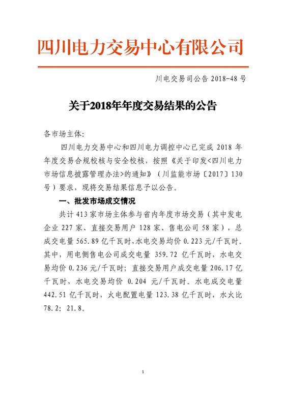 四川電力交易中心和四川電力調(diào)控中心已完成2018年年度交易合規(guī)校核與安全校核,按照《關(guān)于印發(fā)<四川電力市場(chǎng)信息披露管理辦法>的通知》(川監(jiān)能市場(chǎng)〔2017〕130號(hào))要求,現(xiàn)將交易結(jié)果信息予以公告,詳見(jiàn)附件。