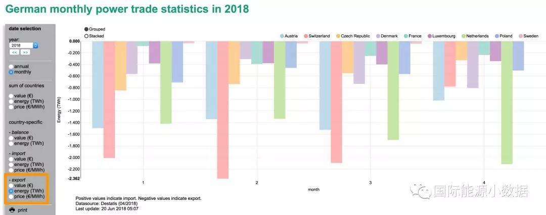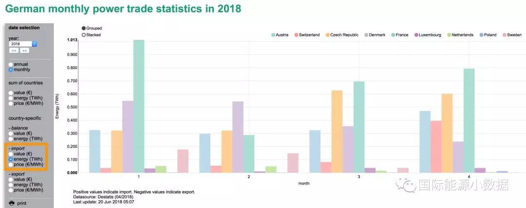 中國儲能網(wǎng)訊:2018年1月至4月,德國出口電力28.878 TWh,進(jìn)口電力8.759 TWh,凈出口20.119 TWh。