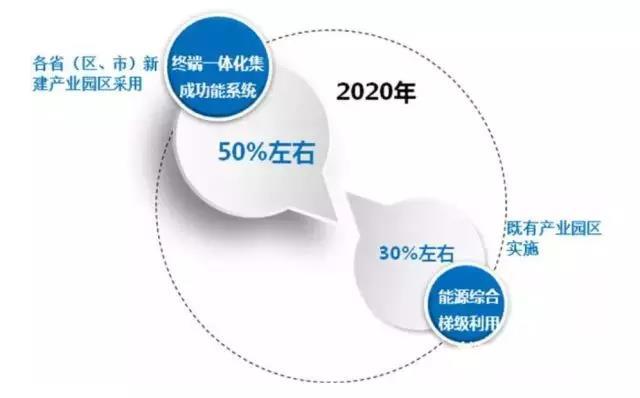 到2020年,各省(區(qū)、市)新建產(chǎn)業(yè)園區(qū)采用終端一體化集成供能系統(tǒng)的比例達(dá)到50%左右,既有產(chǎn)業(yè)園區(qū)實(shí)施能源綜合梯級(jí)利用改造的比例達(dá)到30%左右,具體見圖3。由于既有園區(qū)改造成本高,供水、供熱等行業(yè)存在壟斷難以介入,且改造比例相對(duì)較小,因此以新建產(chǎn)業(yè)園區(qū)作為重點(diǎn)布局。