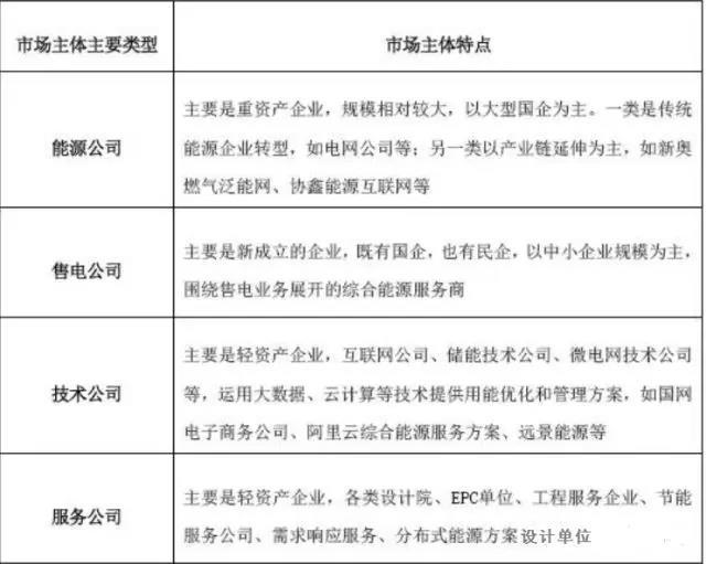 基于以上分析,最有可能成為綜合能源服務(wù)商的主力軍是能源公司和售電公司,而大多數(shù)能源公司主要以大型國(guó)企背景的公司為主具有先天優(yōu)勢(shì),另外像協(xié)鑫、新奧這樣有實(shí)力的民營(yíng)企業(yè)不容小覷,另外最有可能崛起的就是售電公司。售電公司將以售電為切入點(diǎn),進(jìn)行業(yè)務(wù)拓展,而這部分公司存在大量的民營(yíng)企業(yè),只要有好的商業(yè)模式就會(huì)迅速崛起。