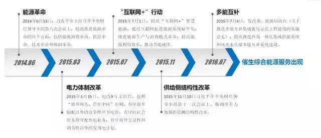 2014年6月13日,中央財(cái)經(jīng)領(lǐng)導(dǎo)小組第6次會(huì)議明確提出了我國(guó)能源安全發(fā)展的“四個(gè)革命”戰(zhàn)略思想,即:推動(dòng)能源消費(fèi)革命,抑制不合理能源消費(fèi);推動(dòng)能源供給革命,建立多元供應(yīng)體系;推動(dòng)能源技術(shù)革命,帶動(dòng)產(chǎn)業(yè)升級(jí);推動(dòng)能源體制革命,打通能源發(fā)展快車道。隨后電力體制改革9號(hào)文出臺(tái),按照“管住中間,放開兩頭”的原則,提出“三放開、一獨(dú)立”政策,而供給側(cè)結(jié)構(gòu)性改革著力在去產(chǎn)能方面發(fā)力,特別是煤炭去產(chǎn)能成為能源領(lǐng)域的重要內(nèi)容,并以“互聯(lián)網(wǎng)+”智慧能源這一新概念促進(jìn)能源系統(tǒng)扁平化,加上多能互補(bǔ)的發(fā)展方向,這一系列政策的出臺(tái)(具體見圖1)有效地推動(dòng)了能源供應(yīng)結(jié)構(gòu)向多元化發(fā)展,從而促進(jìn)新業(yè)態(tài)的發(fā)展,催生新的商業(yè)模式,即綜合能源服務(wù)的誕生。