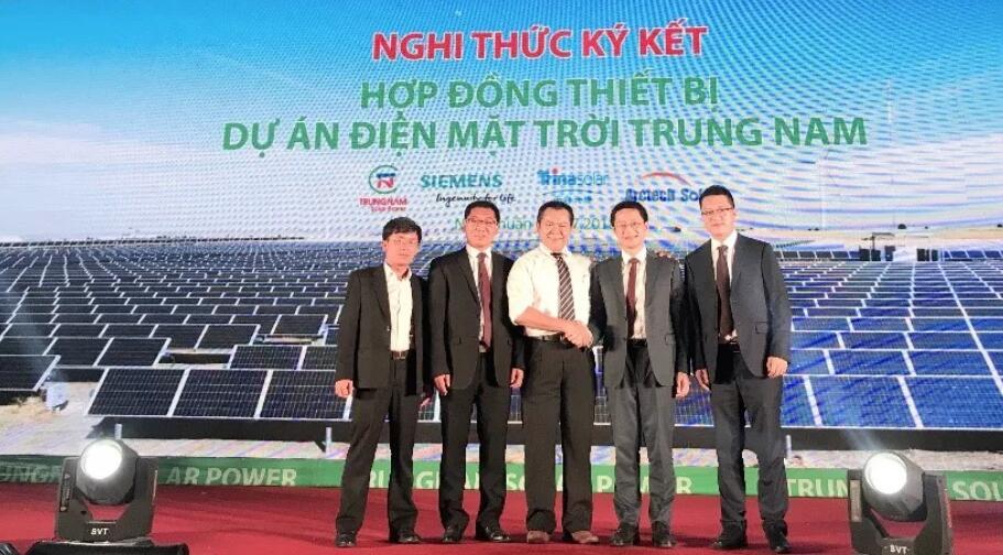 中信博新能源國際中心總裁容崗(右二)和Trungnam Group執(zhí)行總裁 Nguyen Tam Tien(中間)