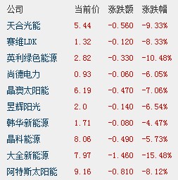 賽維LDK、阿特斯太陽能、晶澳太陽能、昱輝陽光、尚德電力、晶科能源跌幅均超5%,只有韓華新能源跌幅小于5%,但也達到4.47%。