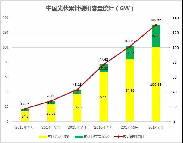 如下圖,我國(guó)光伏電站裝機(jī)規(guī)模從2013年不足20GW到2017年底的130GW,650%的增長(zhǎng)幅度僅用了4年的時(shí)間。作為一個(gè)需要國(guó)家補(bǔ)貼的行業(yè),在可再生能源基金池沒有增加的情況下,我國(guó)光伏產(chǎn)業(yè)的發(fā)展早已偏離了健康的軌道。