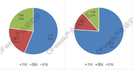 方形份額增長較快的原因是寧德時代和比亞迪的裝機量大增,兩家的市場份額占市場總裝機量的63.12%,占方形市場的82.98%。方形市場前五名的市場份額占據(jù)方形裝機量的95.27%,市場份額不斷集中。