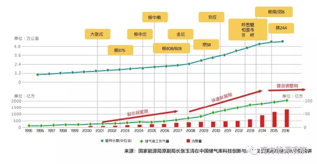 中國的儲(chǔ)氣調(diào)峰能力建設(shè)啟動(dòng)于1999年,隨著西氣東輸?shù)忍烊粴忾L(zhǎng)輸管道建設(shè)及天然氣工業(yè)發(fā)展而發(fā)展,歷經(jīng)起步探索期和快速發(fā)展初期兩個(gè)階段。中國首次大規(guī)模采用儲(chǔ)氣庫調(diào)峰,始于陜京輸氣管道工程。為了解決北京市季節(jié)用氣不均衡的問題,保證向北京市穩(wěn)定供氣,1999年,中石油修建了大港油田大張坨地下儲(chǔ)氣庫。大港儲(chǔ)氣庫除了向北京供氣以外,還有部分天然氣供應(yīng)天津、河北滄州等地。為保證供氣安全,2001年來,繼大張坨地下儲(chǔ)氣庫后,中石油又陸續(xù)建成了板876地下儲(chǔ)氣庫和板中北高點(diǎn)地下儲(chǔ)氣庫。