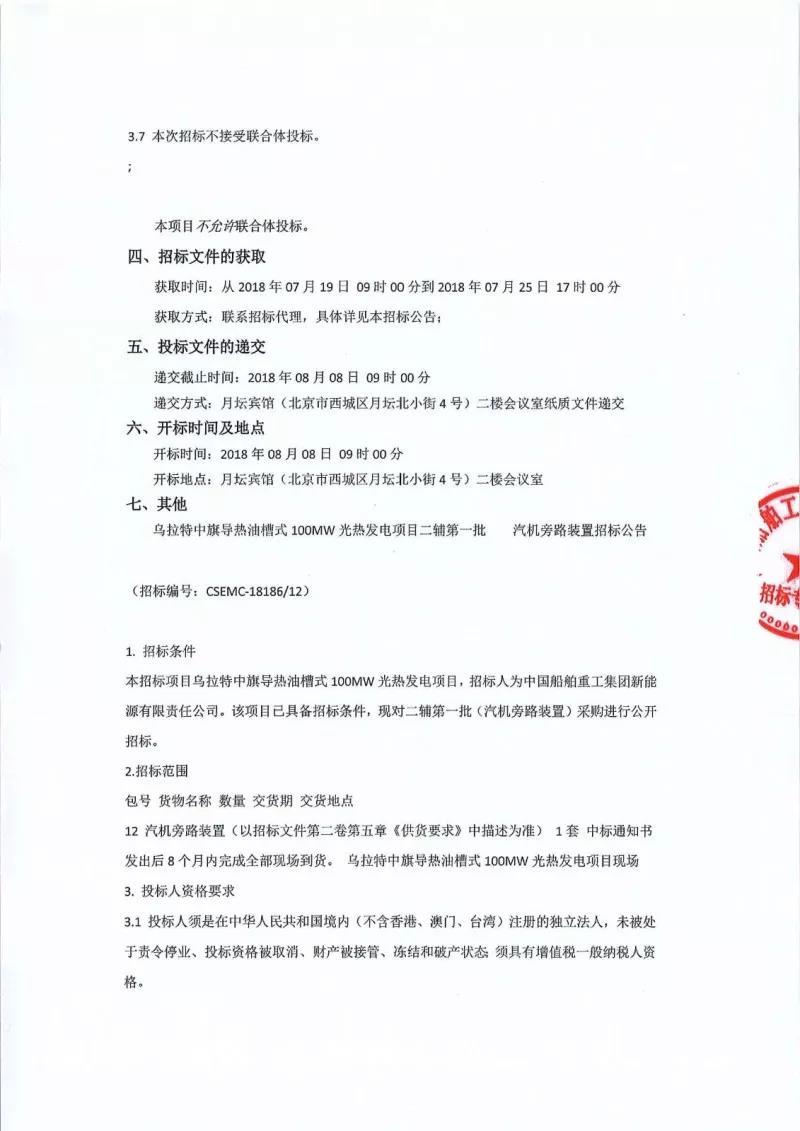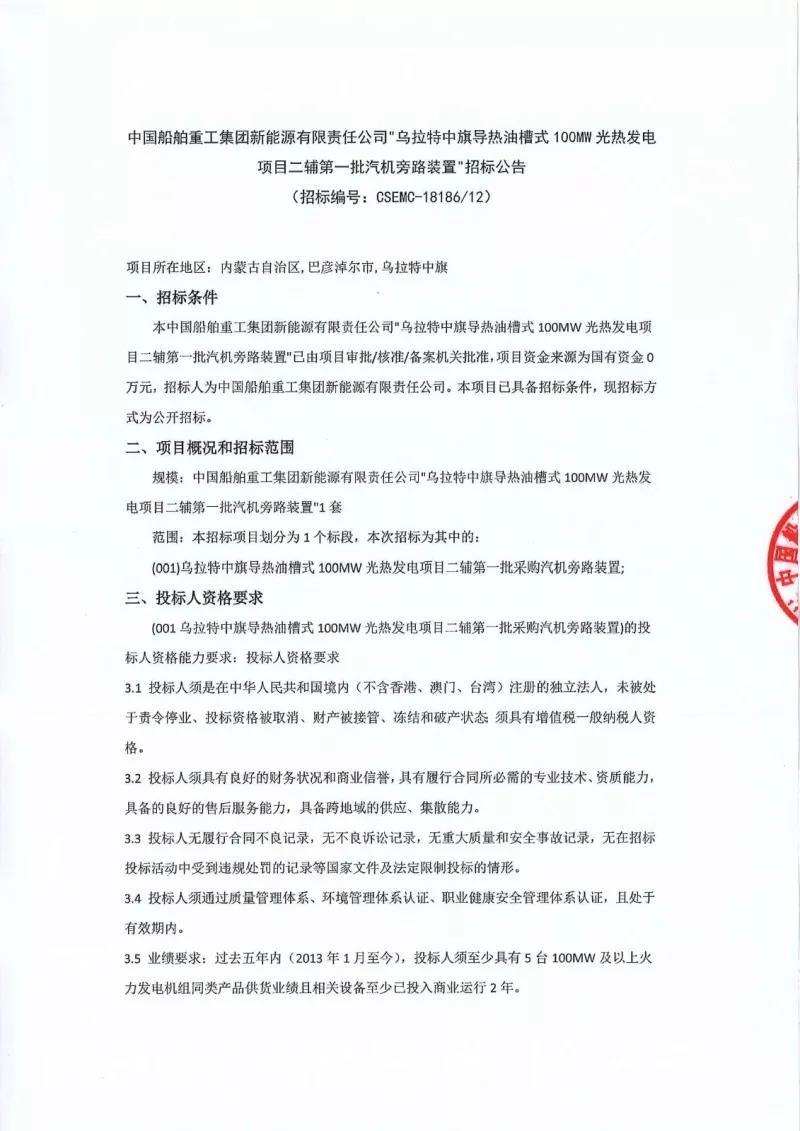 中國(guó)儲(chǔ)能網(wǎng)訊:7月18日,烏拉特中旗100MW槽式光熱發(fā)電示范項(xiàng)目發(fā)布二輔第一批汽機(jī)旁路裝置、二輔第二批化學(xué)加藥裝置、凝結(jié)水除鐵過(guò)濾裝置、汽水機(jī)中取樣裝置招標(biāo)公告。本次招標(biāo)文件的獲取時(shí)間段為2018年7月19日9:00至7月25日17:00,投標(biāo)文件的遞交截止時(shí)間及開(kāi)標(biāo)時(shí)間均為8月8日9:00。本次招標(biāo)不接受代理商投標(biāo),不接受聯(lián)合體投標(biāo)。