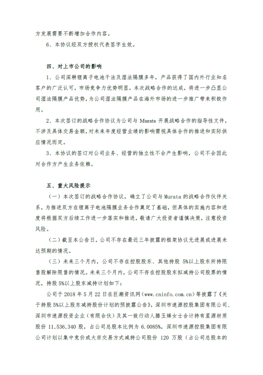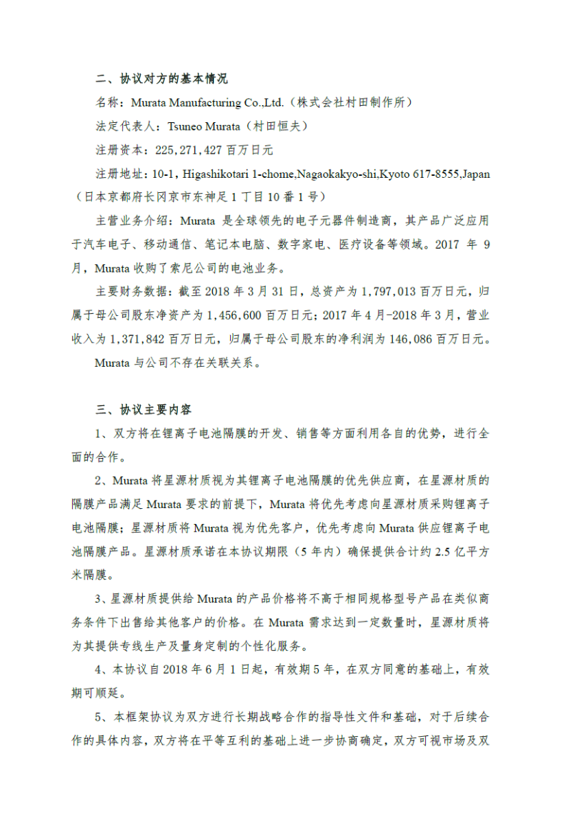 根據(jù)協(xié)議,Murata 將星源材質(zhì)視為其鋰離子電池隔膜的優(yōu)先供應(yīng)商,在星源材質(zhì)的隔膜產(chǎn)品滿足 Murata 要求的前提下,Murata 將優(yōu)先考慮向星源材質(zhì)采購鋰離子電池隔膜,而星源材質(zhì)提供給Murata 的產(chǎn)品價格將不高于相同規(guī)格型號產(chǎn)品在類似商務(wù)條件下出售給其他客戶的價格。