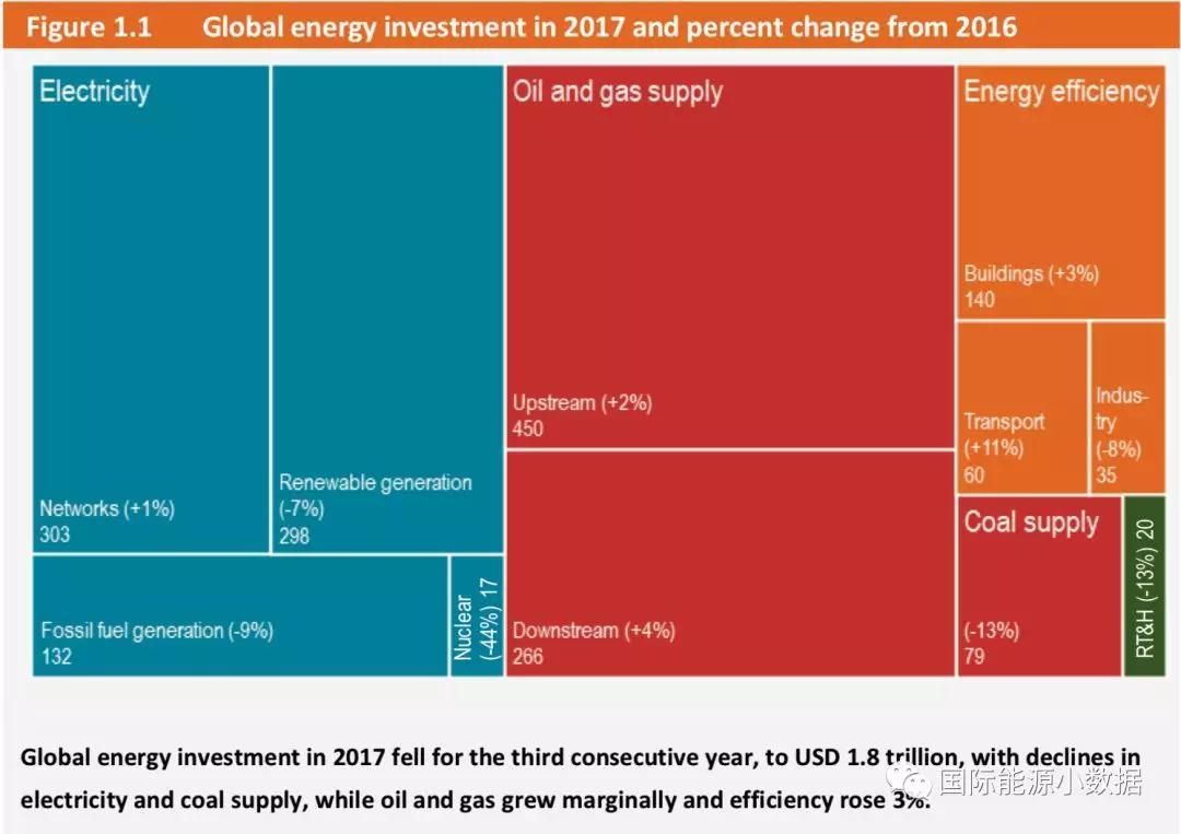 2017年煤炭供應(yīng)投資總額為790億美元(-13%);化石能源發(fā)電投資1320億美元(-9%);而核電投資僅為170億美元,與上一年相比下降幅度高達(dá)44%。