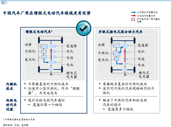 中國(guó)式電動(dòng)汽車可能會(huì)是增程式電動(dòng)汽車。我們的研究表明,增程式電動(dòng)汽車(即串聯(lián)式插電式混合動(dòng)力汽車)— 內(nèi)置小型內(nèi)燃機(jī)以在行駛過(guò)程為電池不斷充電的電動(dòng)汽車,可能對(duì)于中國(guó)相對(duì)滯后的汽車行業(yè)來(lái)講成本更低、也更容易實(shí)施。