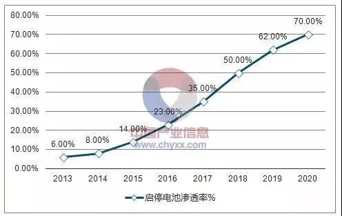 中國(guó) 2013-2020 年汽車啟停電池滲透率