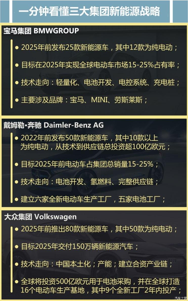以奔馳、寶馬、奧迪為首的傳統(tǒng)車企截止目前都已經(jīng)有了明確的規(guī)劃,如此一致性的動作從兩個方面受到威脅,第一是全球各國政策都在嚴卡汽車排放標準,推崇低排放或者0排放汽車,燃油車的技術(shù)和市場發(fā)展都被政策所挾持住。而研發(fā)低排放車型在當前的趨勢下,市場收益不見得會高于轉(zhuǎn)型電氣化,加上中國市場的需求趨勢,技術(shù)向純電動和插電式混合方向發(fā)展已經(jīng)是必然選擇。