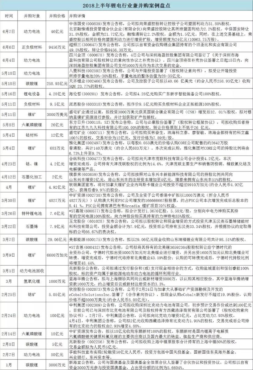 對此,高工鋰電盤點了2018上半年鋰電領(lǐng)域的兼并購案例,且看下圖: