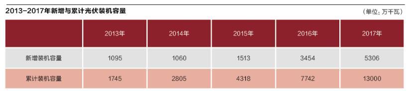 截至2015年底,中國光伏發(fā)電累計裝機容量4318萬千瓦,問鼎全球光伏發(fā)電裝機容量最大國家?;仡?017年,中國新增光伏并網(wǎng)裝機容量達到53.06GW,同比增長53.6%。累計光伏裝機并網(wǎng)量達到130.25GW,同比增長68%。新增和累計裝機容量均為全球第一。其中,光伏電站累計裝機容量100.59GW,分布式累計裝機容量29.66GW。