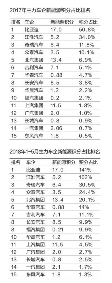 從過去兩年的新能源積分情況看,自主車企中無疑是新能源積分的大戶。據(jù)工信部公布的2017年數(shù)據(jù),前五家新能源正積分都超過10萬,其中比亞迪積分達(dá)到22.34萬、北汽新能源達(dá)到21.85萬,而吉利汽車也達(dá)到14.4萬。