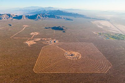 伊萬帕(The Ivanpah)太陽能熱電廠使用排列成同心圓的鏡子,把太陽光聚焦到中央塔,形成高溫,產(chǎn)生蒸汽。這家工廠會采用三座塔,每座塔都有自己的一套鏡子。第一組機(jī)組在前部,是最近完成的。今年2月,工人們已開始安裝鏡子,可以看到,就在圖中左上角和場地右側(cè)。來源:麻省理工科技創(chuàng)業(yè)
