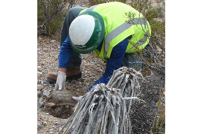 布萊特索斯公司發(fā)現(xiàn)了數(shù)量驚人沙漠陸龜,就在伊萬帕的場地。生物學(xué)家已經(jīng)集中這些龜,正在重新安置,也在進(jìn)行監(jiān)測。這幅圖像顯示,在去年9月,工人們把一只龜安置在新洞穴附近,就在伊萬帕場地外。來源:麻省理工科技創(chuàng)業(yè)公司