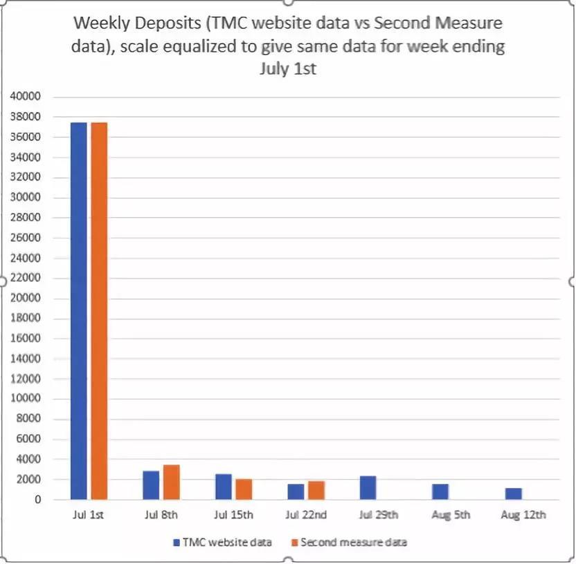 特斯拉汽車俱樂部(Tesla Motors Club,下稱“TMC”)網(wǎng)站上的Model 3訂單跟蹤表(Model 3 Order Tracker spreadsheet),按日期跟蹤新配置的車輛。在下面的圖表中,我將Second Measure數(shù)據(jù)與TMC表格的數(shù)據(jù)進(jìn)行了比較。