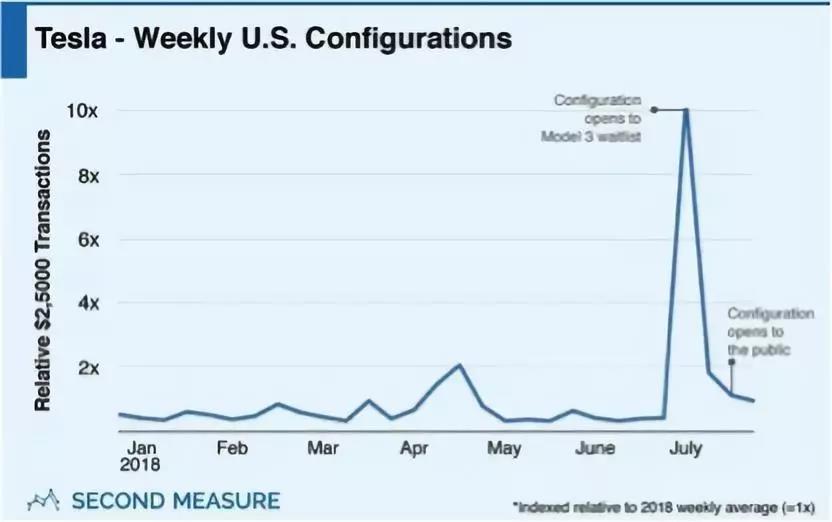 1.當(dāng)特斯拉對(duì)所有Model3預(yù)訂用戶開放選配時(shí),訂單數(shù)量出現(xiàn)了暫時(shí)的大幅增長(zhǎng)。