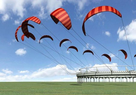 現(xiàn)代商業(yè)風車的葉片聳立在距離地面大約80米的高空,風速大約是每秒5米。然而在800米的高空,風速上升到每秒7米,因此能產(chǎn)生更大能量。事實上,要制造一個可以利用800米高空的風能渦輪機根本就不可能,但是風箏風力發(fā)電機很容易就能達到這個高度。KiteGen采用了多個降落傘形、大翼展的高空風箏,宣稱能夠產(chǎn)生十億瓦特的綠色低成本電能。