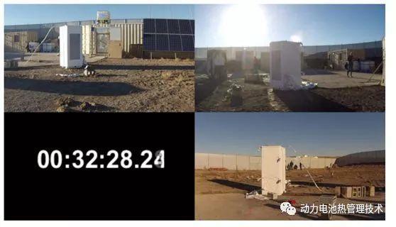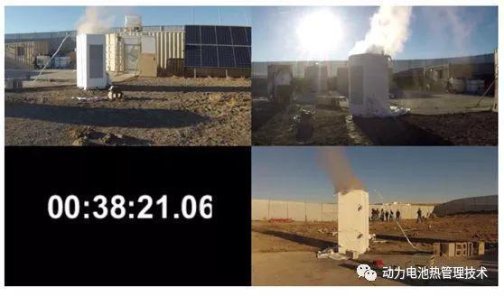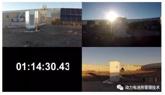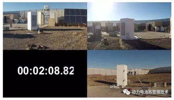 閑話少說,直接看實驗過程,儲能系統(tǒng)布置在空曠的室外,采用兩個100KWh的儲能單元,實驗前電池處于滿電態(tài),分別對電池進行外部及內(nèi)部加熱,觸發(fā)電池?zé)崾Э?,使其發(fā)生燃燒甚至爆炸。
