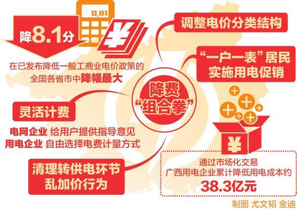 據(jù)廣西物價(jià)局負(fù)責(zé)人介紹,從今年5月1日起,廣西已經(jīng)平均降低工商業(yè)及其他用電(單一制)電價(jià)每千瓦時(shí)5.15分;加上此次平均降價(jià)每千瓦時(shí)2.95分,今年廣西工商業(yè)及其他用電(單一制)電價(jià)累計(jì)降幅達(dá)8.1分,在已發(fā)布降低一般工商業(yè)電價(jià)政策的全國(guó)各省市中降幅最大,完成國(guó)家提出的 “一般工商業(yè)電價(jià)平均下降10%”的目標(biāo)。