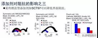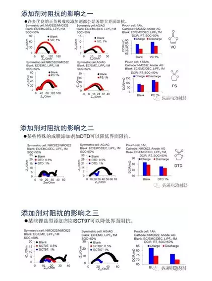 目前,添加劑對(duì)阻抗的影響有三種典型的類(lèi)型:一是很多優(yōu)良的正負(fù)極成膜添加劑會(huì)顯著增大界面阻抗,如最常用的性能優(yōu)異的正負(fù)極成膜添加劑VC和PS都會(huì)明顯增加正負(fù)極的界面阻抗;二是一些特殊的成膜添加劑在一定情況下可以降低界面阻抗,如DTD;三是一些鋰鹽型添加劑可以顯著降低界面阻抗,如SCT97。詳情請(qǐng)看下圖。