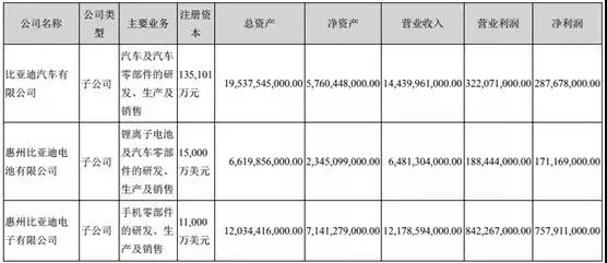 公告還顯示,比亞迪主要子公司及對公司凈利潤影響達(dá)10%以上的參股公司情況(見下圖,單位:元),其中惠州比亞迪電池有限公司實(shí)現(xiàn)營業(yè)收入64.81億元,凈利潤1.71億元。