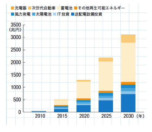 電動(dòng)車(chē)產(chǎn)業(yè)(次世代自動(dòng)車(chē))雖然消耗電池的數(shù)量甚高,但是在基礎(chǔ)建設(shè)尚未成熟且周邊延伸產(chǎn)業(yè)尚未成形之際,于近五年內(nèi)仍舊難以大規(guī)模普及;反觀儲(chǔ)能電池(蓄電池)產(chǎn)業(yè)除可搭配著再生能源做應(yīng)用,也可單獨(dú)使用作為緊急備用電力系統(tǒng),未來(lái)的市場(chǎng)需求可期。根據(jù)日本METI預(yù)估(圖一),全球儲(chǔ)能系統(tǒng)需求將隨著智能城市的興起而成長(zhǎng),以日本市場(chǎng)而言,因?yàn)闉?zāi)害所促成的城鎮(zhèn)再造機(jī)會(huì),將更加速落實(shí)新型態(tài)能源應(yīng)用的進(jìn)程,預(yù)估將在2012年開(kāi)始在日本市場(chǎng)會(huì)有明顯的成長(zhǎng)需求,未來(lái)五年更會(huì)快速擴(kuò)展至全球各主要城鎮(zhèn)地區(qū)。