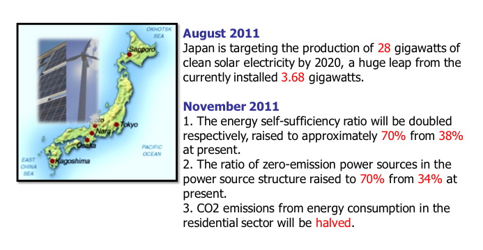 對(duì)于日本而言,能源獨(dú)立,已是刻不容緩的事情。2011年日本福島大地震之后,核災(zāi)的問(wèn)題讓日本開(kāi)始重視再生能源的實(shí)際應(yīng)用,2012年第一季度甚至開(kāi)始計(jì)劃關(guān)閉所有核電廠,而太陽(yáng)能將會(huì)是未來(lái)的重要發(fā)電方式之一。