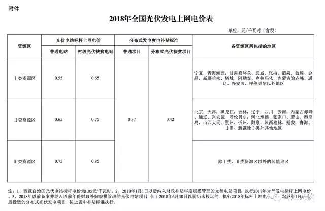 為落實國務院辦公廳《能源發(fā)展戰(zhàn)略行動計劃(2014-2020)》關于新能源標桿上網電價逐步退坡的要求,合理引導新能源投資,促進光伏發(fā)電產業(yè)健康有序發(fā)展,決定調整2018年光伏發(fā)電標桿上網電價政策。經商國家能源局,現就有關事項通知如下: