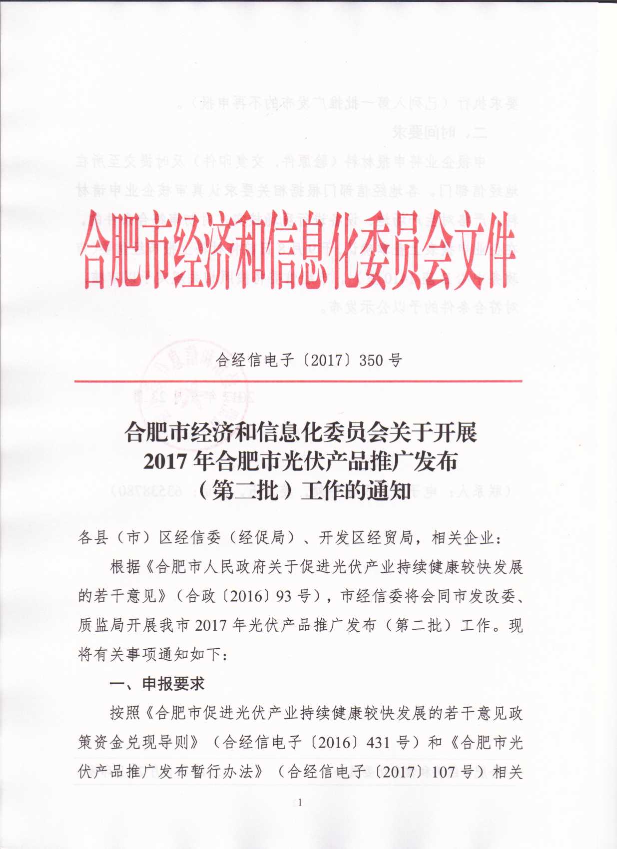 中國儲(chǔ)能網(wǎng)訊:合肥市經(jīng)濟(jì)與信息化委員化關(guān)于開展2017年合肥市光伏產(chǎn)品推廣發(fā)布(第二批)的通知