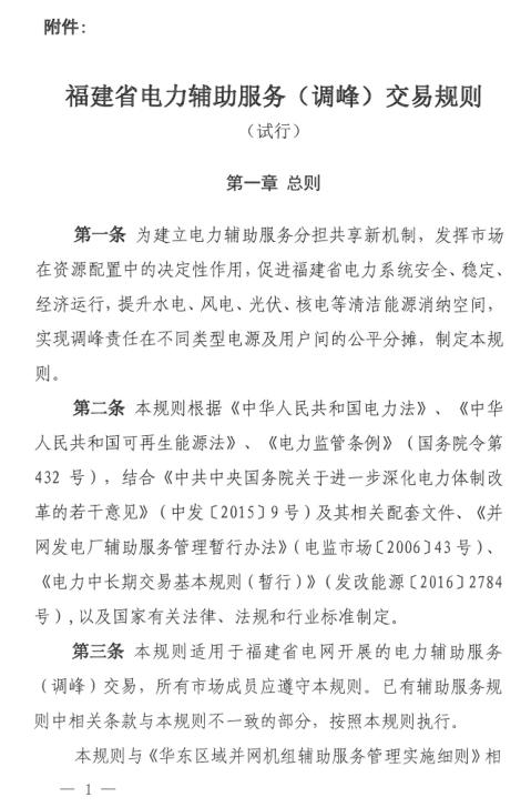 中國儲能網(wǎng)訊:國家能源局福建監(jiān)管辦日前印發(fā)了《福建省電力輔助服務(wù)(調(diào)峰)交易規(guī)則(試行)》。規(guī)則試行于福建省電網(wǎng)開展的電力輔助服務(wù)(調(diào)峰)交易。本規(guī)則與《華東區(qū)域并網(wǎng)機組輔助服務(wù)管理實施細則》相銜接,不重復(fù)考核或補償,未綱入本規(guī)則的部分,仍按華東區(qū)域“兩個細則”執(zhí)行。逐步擴大電力輔助服務(wù)市場化交易,豐富交易內(nèi)容,研究探索現(xiàn)貨市場交易。