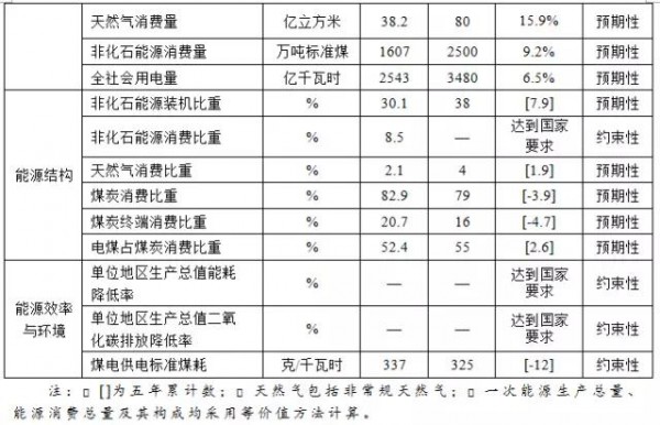 ——能源結(jié)構(gòu)。進(jìn)一步提高非化石能源裝機(jī)和消費(fèi)比重,非化石能源裝機(jī)比重達(dá)到38%左右,非化石能源消費(fèi)比重達(dá)到國(guó)家要求。天然氣消費(fèi)比重提高到4%左右,煤炭消費(fèi)比重降低到79%左右。煤炭終端消費(fèi)比重下降到16%左右,電煤占煤炭消費(fèi)比重提高到55%左右。