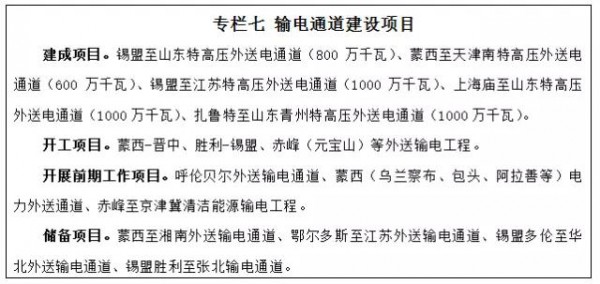 結(jié)合全國(guó)電力供需整體形勢(shì)、電源基地開發(fā)進(jìn)度等因素,堅(jiān)持適度超前的原則,采用大容量、遠(yuǎn)距離、高效率的特高壓先進(jìn)輸電技術(shù),加快電力外送通道及配套接網(wǎng)工程建設(shè),進(jìn)一步提高電力外送規(guī)模。“十三五”期間,建成錫盟-山東、錫盟-江蘇、上海廟-山東、蒙西-天津南、扎魯特-山東青州等特高壓外送電通道。爭(zhēng)取開工建設(shè)蒙西-晉中、勝利-錫盟、赤峰(元寶山)等外送輸電工程。結(jié)合受端市場(chǎng)情況,積極推進(jìn)呼倫貝爾、蒙西(烏蘭察布、包頭、阿拉善等)、赤峰-京津冀等電力外送通道論證。力爭(zhēng)到2020年電力外送形成“兩交三直”特高壓、多條超高壓外送通道格局。