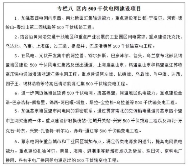 加快新能源外送基地建設(shè)。優(yōu)化配電網(wǎng)、匯集站規(guī)劃和建設(shè),加強(qiáng)風(fēng)能、太陽(yáng)能等新能源匯集能力和效率,著力打造阿拉善(烏海、巴彥淖爾)、包頭北(巴彥淖爾)、鄂爾多斯(巴彥淖爾、烏海、阿拉善)、烏蘭察布(呼和浩特)、錫林郭勒、赤峰、通遼、呼倫貝爾(興安)等8個(gè)新能源基地。重點(diǎn)依托錫盟-山東、錫盟-江蘇、上海廟-山東、蒙西-天津南、扎魯特-山東青州等電力外送通道,加快推進(jìn)通道配套外送新能源項(xiàng)目建設(shè),積極推動(dòng)赤峰、蒙西(烏蘭察布、包頭、阿拉善等)清潔能源外送基地開展前期工作。“十三五”期間,力爭(zhēng)新增新能源外送裝機(jī)2300萬千瓦左右,其中風(fēng)電1800萬千瓦,太陽(yáng)能發(fā)電500萬千瓦左右。