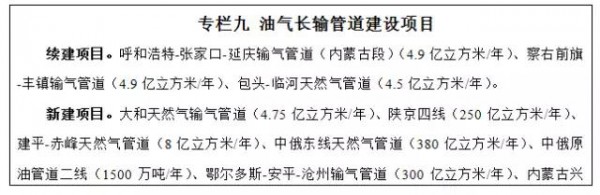 統(tǒng)籌考慮自治區(qū)石油天然氣資源以及煤制燃料項(xiàng)目建設(shè)情況,進(jìn)一步完善油氣管網(wǎng),提高油氣供應(yīng)保障能力?!笆濉逼陂g,建成陜京四線、中俄東線、建平-赤峰、呼和浩特-張家口-延慶輸氣管道(內(nèi)蒙古段)、包頭-臨河、大路-和林格爾、察右前旗-豐鎮(zhèn)輸氣管道和中俄原油管道二線等項(xiàng)目。根據(jù)市場(chǎng)發(fā)展及油氣源項(xiàng)目建設(shè)情況,適時(shí)推進(jìn)訥河-阿榮旗、張家口至錫林浩特、烏蘭察布-二連浩特、烏蘭察布-桑根達(dá)來-錫林浩特、桑根達(dá)來-克什克騰旗、中俄西線、杭錦旗-銀川天然氣管道、呼倫貝爾-齊齊哈爾-哈爾濱煤制氣、西氣東輸五線輸氣管道和蒙西、蒙東煤制油外輸管道等項(xiàng)目的前期工作?!笆濉逼陂g,力爭(zhēng)新增輸油能力1500萬噸、輸氣能力657億立方米左右。加大油氣長(zhǎng)輸管道安全隱患排查和整改力度,持續(xù)開展油氣長(zhǎng)輸管道安全大排查、大整治專項(xiàng)行動(dòng)。加強(qiáng)儲(chǔ)氣設(shè)施建設(shè),進(jìn)一步提高天然氣調(diào)峰和應(yīng)急儲(chǔ)氣能力。
