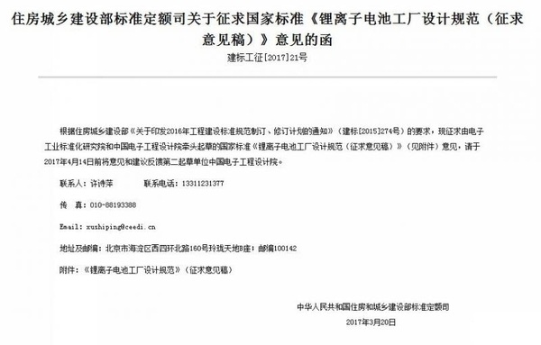 中國儲能網(wǎng)訊:3月21日,住房城鄉(xiāng)建設部標準定額司公布《鋰離子電池工廠設計規(guī)范(征求意見稿)》(以下簡稱《設計規(guī)范》),《設計規(guī)范》就鋰電池企業(yè)工廠設計的國家標準公開征求意見。