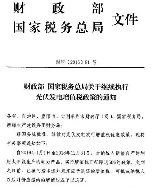 中國(guó)儲(chǔ)能網(wǎng)訊:分布式能源財(cái)政部、國(guó)家稅務(wù)總局之前宣布,自2013年10月1日至2015年12月31日,對(duì)納稅人銷售自產(chǎn)的利用太陽(yáng)能生產(chǎn)的電力產(chǎn)品,實(shí)行增值稅即征即退50%的政策。 如今3年期限已過(guò),兩部委再次宣布,下一個(gè)3年,繼續(xù)實(shí)行該政策。