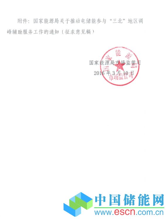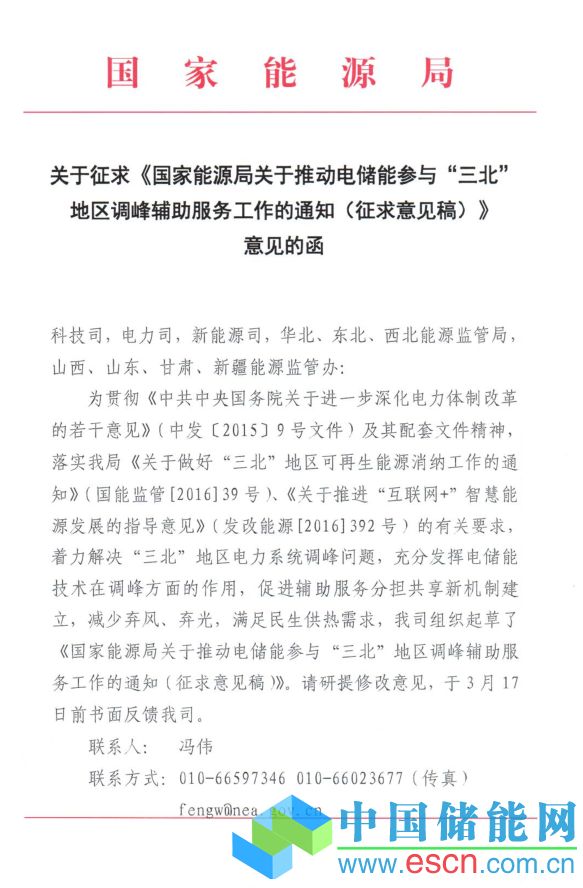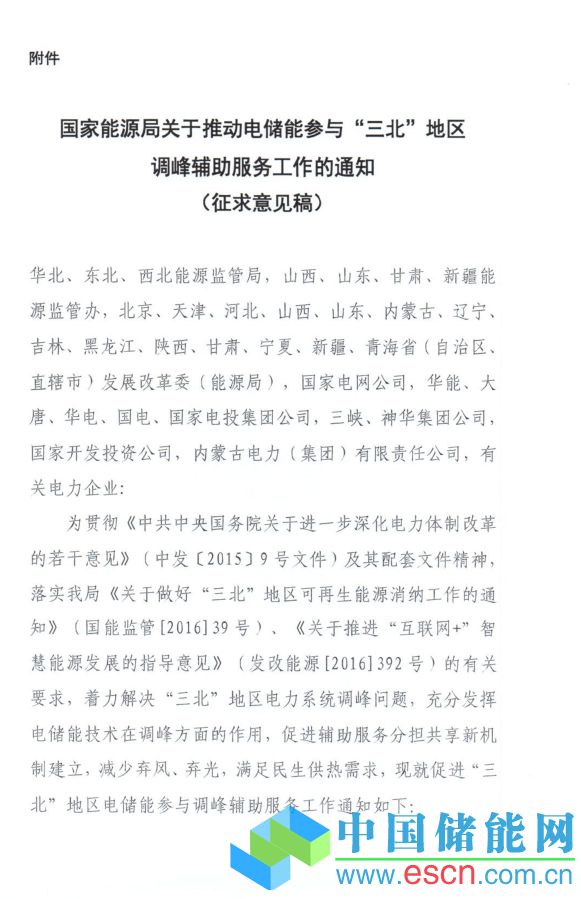中國儲能網(wǎng)訊:為貫徹《中共中央國務(wù)院關(guān)于進(jìn)一步深化電力體制改革的若干意見》(中發(fā)〔2015〕9號文件)及其配套文件精神,落實國家能源局《關(guān)于做好“三北”地區(qū)可再生能源消納工作的通知》(國能監(jiān)管〔2016〕39號)、《關(guān)于推進(jìn)“互聯(lián)網(wǎng)+”智慧能源發(fā)展的指導(dǎo)意見》(發(fā)改能源〔2016〕392號)的有關(guān)要求,著力解決“三北”地區(qū)電力系統(tǒng)調(diào)峰問題,充分發(fā)揮電儲能技術(shù)在調(diào)峰方面的作用,促進(jìn)輔助服務(wù)分擔(dān)共享新機(jī)制建立,減少棄風(fēng)、棄光,滿足民生供熱需求,能源局市場監(jiān)管司起草了《國家能源局關(guān)于推動電儲能參與“三北”地區(qū)調(diào)峰輔助服務(wù)工作的通知(征求意見稿)》。具體內(nèi)容如下:
