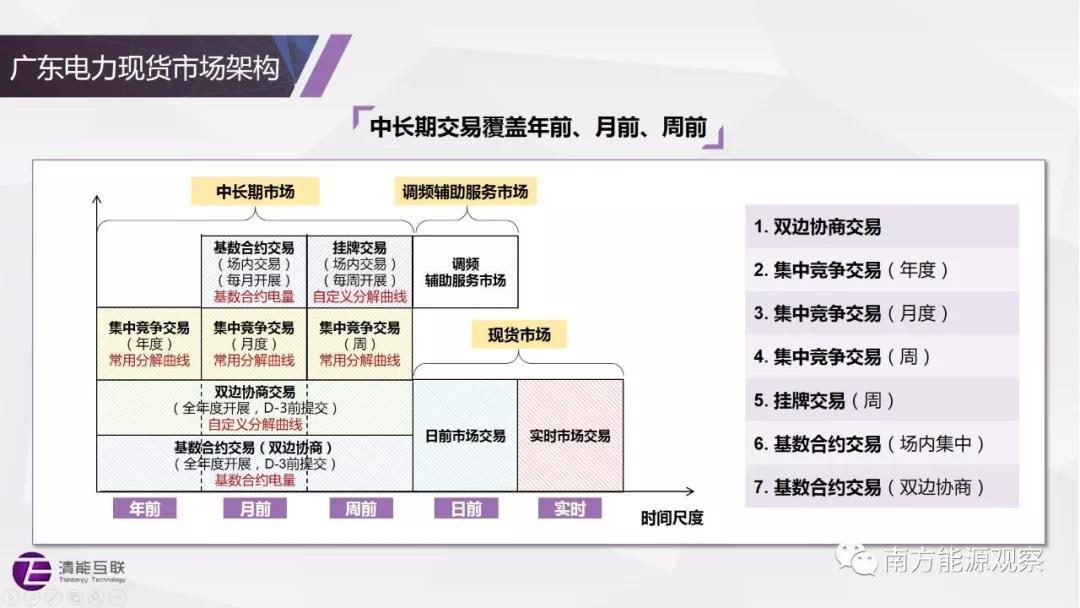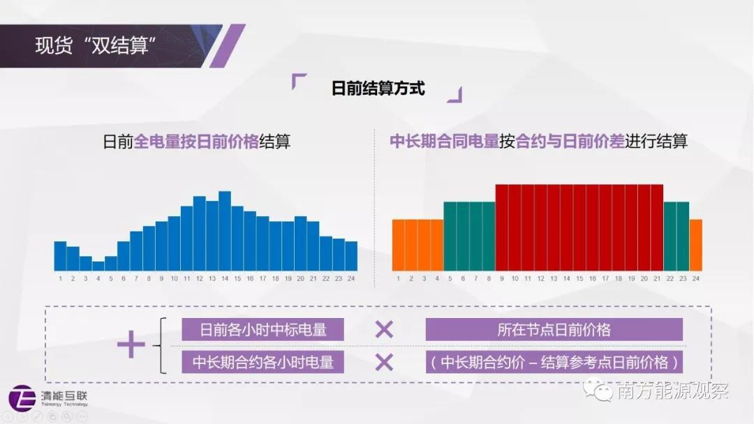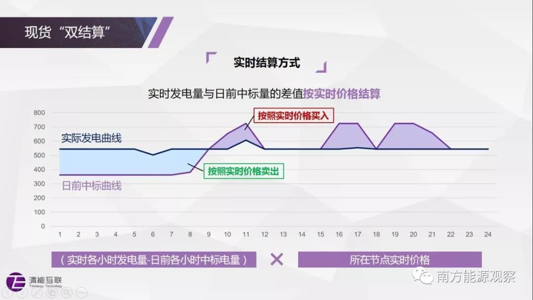 南方(以廣東起步)現(xiàn)貨市場(chǎng)采用雙結(jié)算:日前市場(chǎng)中標(biāo)量按日前現(xiàn)貨價(jià)格結(jié)算;實(shí)時(shí)市場(chǎng)中,與日前市場(chǎng)中標(biāo)量相比,實(shí)際多發(fā)(少用)的電量將以實(shí)時(shí)市場(chǎng)價(jià)格賣出,少發(fā)(多用)的電量將以實(shí)時(shí)市場(chǎng)價(jià)格買入,不再進(jìn)行額外的懲罰;中長(zhǎng)期合約和基數(shù)電量根據(jù)日前市場(chǎng)價(jià)格進(jìn)行差價(jià)結(jié)算,起到鎖定交易電量?jī)r(jià)格的作用。