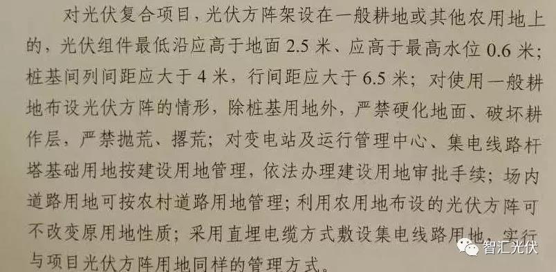 對光伏復(fù)合項(xiàng)目,光伏方陣架設(shè)在一般耕地或其他農(nóng)用地上的,光伏組件最低沿應(yīng)高于地面2.5米,應(yīng)高于最低水位0.6米;樁基間列間距大于4米,行間距應(yīng)大于6.5米”