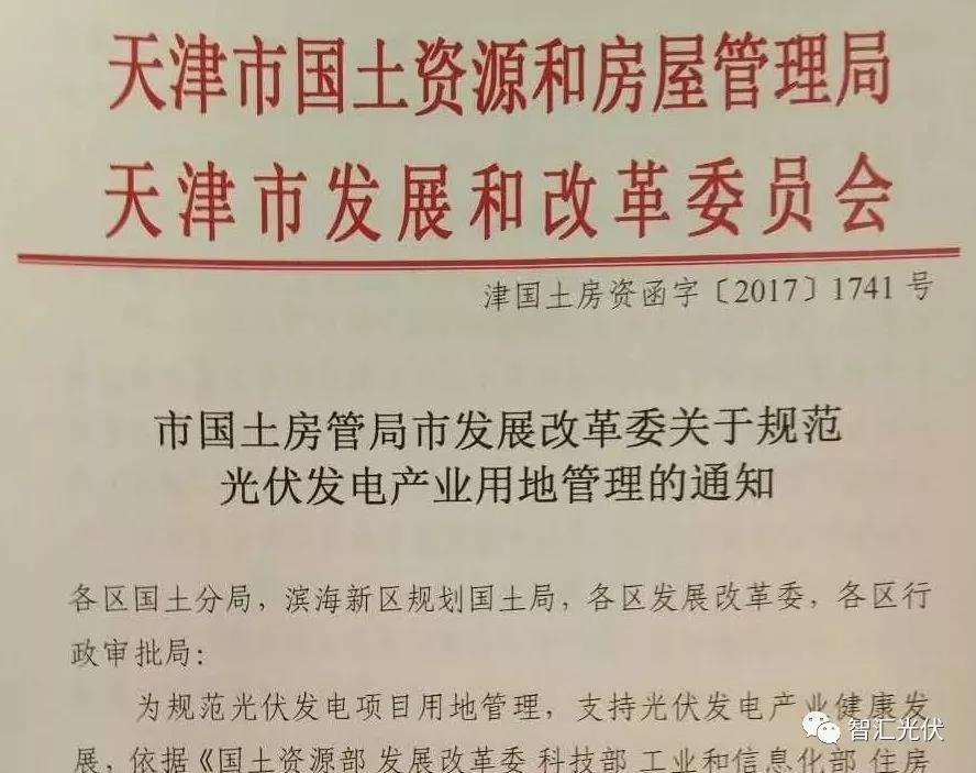 2017年12月11日,天津市國土資源和房屋管理局、天津市發(fā)改委聯(lián)合發(fā)布《關(guān)于規(guī)范光伏發(fā)電產(chǎn)業(yè)用地管理的通知》,文件指出;