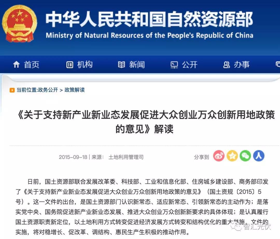 2015年9月,國土資源部等六部門聯(lián)合下發(fā)的《關(guān)于支持新產(chǎn)業(yè)新業(yè)態(tài)發(fā)展促進(jìn)大眾創(chuàng)業(yè)萬眾創(chuàng)新用地的意見》(國土資規(guī)〔2015〕5號)曾經(jīng)明確: